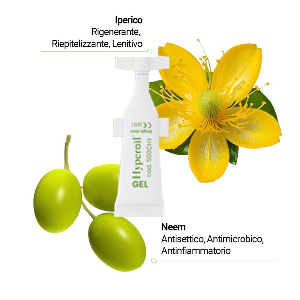 Hyperoil® DERM Gel in fiala è il tuo alleato a base vegetale per il trattamento delle lesioni cutanee di piccole e medie dimensioni. Formulato con Olio di Neem e Fiori di Iperico, offre un supporto ottimale per favorire la rigenerazione e la riparazione dei tessuti cutanei. Grazie al pratico formato in fiala richiudibile da 5 ml, è ideale da portare sempre con te in borsetta, in palestra, in viaggio o al mare. Affrontare piccole ferite o irritazioni cutanee può essere una sfida quotidiana; per questo Hyperoil® DERM Gel è stato sviluppato per coadiuvare la rigenerazione tessutale in modo sicuro e prolungato, offrendo idratazione e sollievo nelle zone più difficili da trattare.