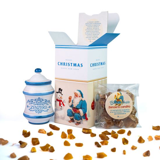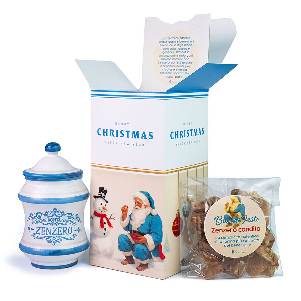 Christmas Box con Zenzero nostalgica e raffinata C’è un fascino intramontabile nel Natale di una volta: i gesti lenti, le luci soffuse, i doni scelti con cura. La Christmas Box – Zenzero nasce per riportare quella magia, con il calore delle cose fatte a mano e la bellezza della tradizione. Zenzero, protagonista di questa elegante box natalizia ispirata alla magia del Natale di una volta. All’interno troverai una giara di ceramica dipinta a mano, dallo stile retrò che ricorda le antiche farmacie di un tempo — un piccolo capolavoro artigianale da conservare nel tempo — e 100 g di zenzero candito, dolce e leggermente piccante, perfetto per accompagnare i momenti più speciali delle feste. Il tutto è racchiuso in una scatolina natalizia dallo stile anni ’50, con una grafica che profuma di tradizione, semplicità e gesti autentici. Una box che non è solo un dono, ma un abbraccio di ricordi e amore, pensato per chi ama la bellezza delle cose fatte con il cuore.