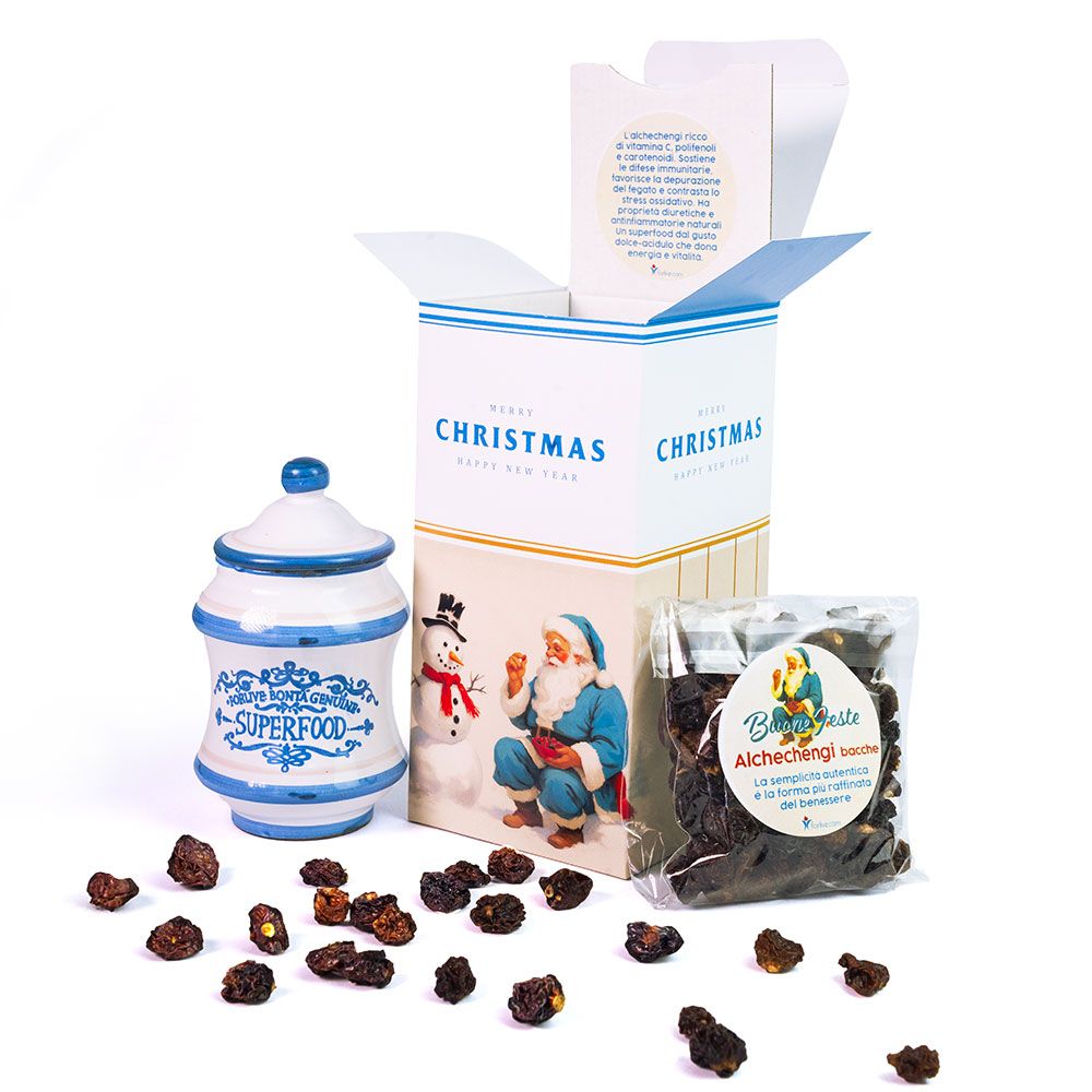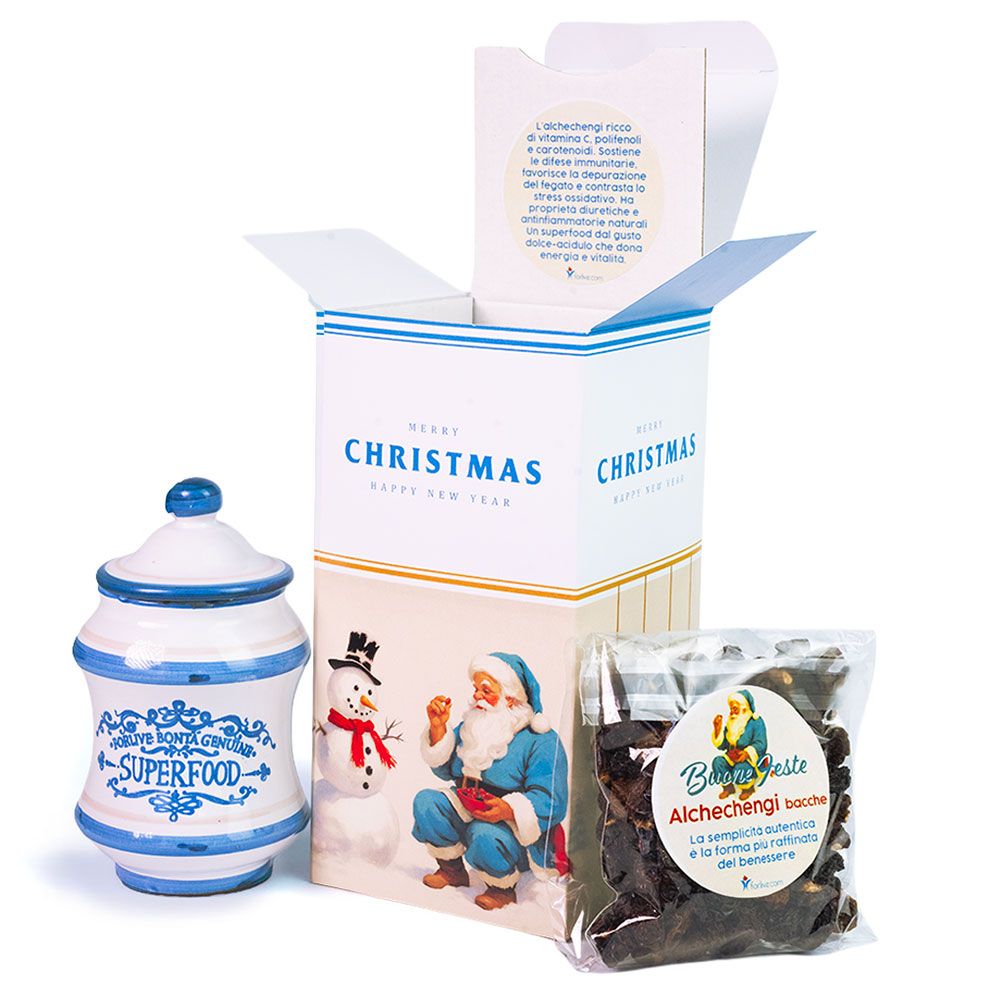 Luminosa come una lanterna d’inverno C’è un fascino intramontabile nel Natale di una volta: i gesti lenti, le luci soffuse, i doni scelti con cura. La Christmas Box – Alchechengi nasce da questa magia, per chi ama regalare qualcosa di autentico, capace di parlare al cuore. All’interno, una giara di ceramica dipinta a mano, ispirata alle antiche farmacie di un tempo, custodisce 100 g di alchechengi essiccato, un frutto dorato e prezioso, simbolo di luce e rinascita. Ogni dettaglio — dalla grafica natalizia in stile anni ’50 alla cura artigianale del contenuto — è pensato per riportare alla mente i Natali di una volta, quando donare era un gesto d’amore sincero. Una box che celebra la tradizione e il piacere di condividere qualcosa di bello, semplice e pieno di significato.