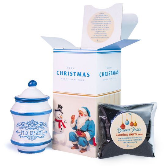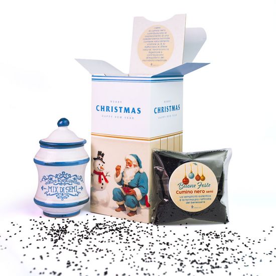 La Christmas Box – Cumino Nero è pensata per chi ama i doni che raccontano una storia. All’interno, una giara di ceramica dipinta a mano in stile vecchia farmacia che custodisce 100 g di semi di cumino nero, conosciuti da sempre come “l’oro dei faraoni” per le loro virtù e il loro aroma intenso. Racchiusa in una scatolina natalizia in stile anni ’50, questa box celebra l’essenza del Natale più autentico: il piacere di regalare qualcosa di vero, nato dalla terra e dal cuore. Un dono che parla di radici, di tradizione e di quella magia semplice che solo i gesti sinceri sanno creare.