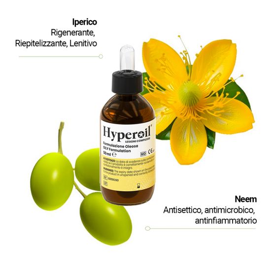 Hyperoil® Olio Flacone con contagocce è il tuo alleato naturale a base vegetale per il trattamento delle lesioni cutanee. Formulato con Olio di Neem ed estratto di fiori di Iperico, offre un supporto efficace nel favorire la rigenerazione della pelle. Il trattamento di lesioni cutanee di medie dimensioni come abrasioni, ferite o ulcere, può comportare vere e proprie sfide, per questo Hyperoil® è stato sviluppato per coadiuvare la riparazione tessutale in modo delicato.
