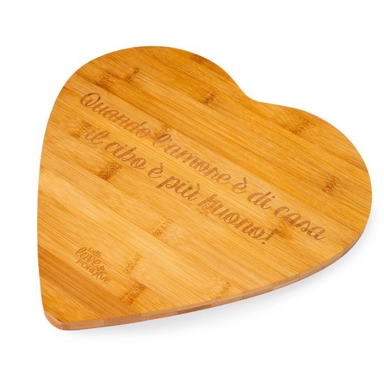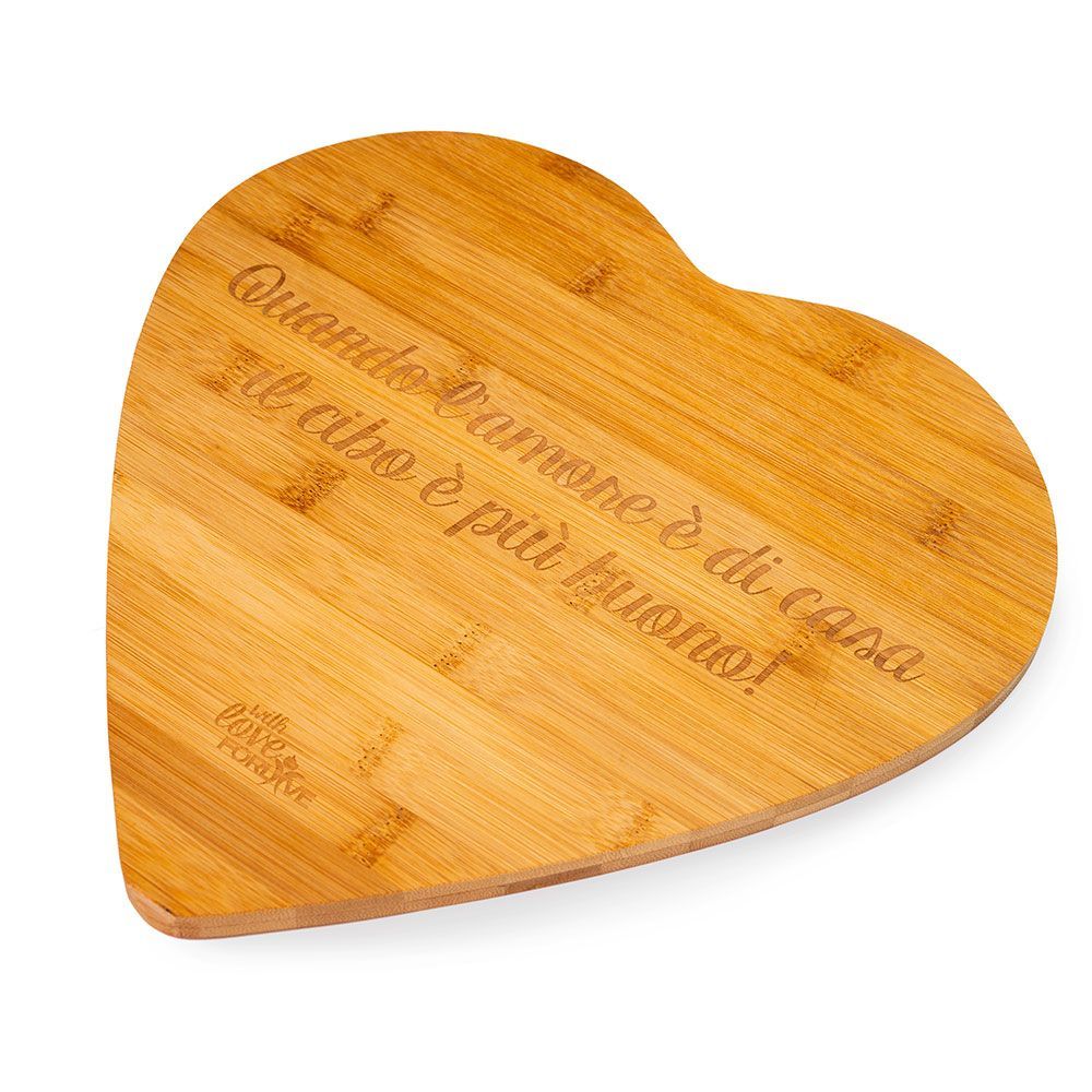 Tagliere in Legno di Bamboo a forma di cuore (30x30x1,2) con inciso al laser "Quando l'amore è di casa il cibo è più buono!"