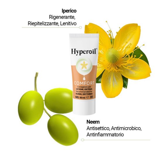 Hyperoil® COMFORT Gel per ustioni è il tuo alleato a base vegetale nel trattamento di ustioni cutanee e scottature solari. Formulato con Fiori di Iperico e Olio di Neem, offre un supporto efficace per favorire la rigenerazione e la riparazione dei tessuti cutanei. Dal delicato aroma alla menta, dona una sensazione di freschezza e sollievo immediato. Affrontare disturbi come scottature di varia natura e ustioni da sole può essere una sfida significativa; per questo Hyperoil® COMFORT Gel è stato sviluppato per coadiuvare la rigenerazione tessutale in modo sicuro e prolungato, grazie alla sua formulazione in gel che prolunga la permanenza del prodotto sulle lesioni. Il pratico formato in tubo da 50 ml è ideale da portare sempre con te in borsetta o in valigia.